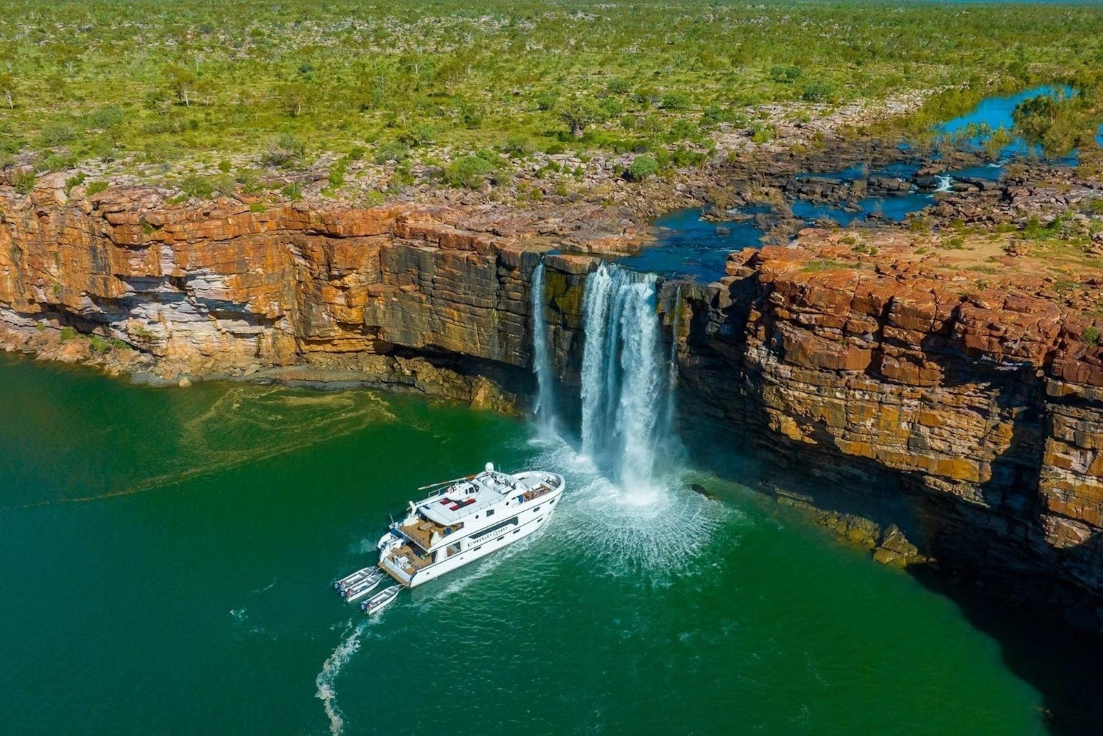 8日間にわたり、「キンバリー」地域の大自然の驚異を感じる絶景を巡るこのクルーズは、「キンバリー」への玄関口「ブルーム」を出港し、世界屈指の干満差がもたらす「水平の滝」や、世界最大の沿岸サンゴ礁「モンゴメリーリーフ」、ボートでしかアクセスできない「クロコダイルクリーク」でのトレッキングなど、迫力ある自然を間近で体感できます。航路が進み「クリ・ベイ」を越えると、まるで恐竜時代に戻ったかのような原始の風景が広がり、アボリジナル文化が色濃く残る特別なエリアへと突入します。ツアーには「ミッチェル滝」を上空から望む遊覧飛行も含まれ、通常の大型船では訪れることのできない秘境を探検する、まさに“究極のキンバリー体験”です。