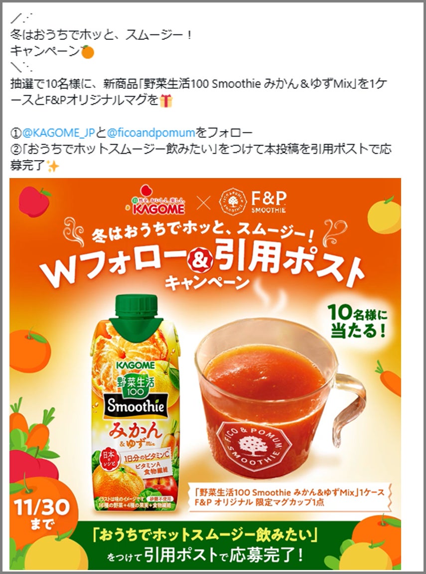 カゴメ公式Xでは「野菜生活100 Smoothie みかん&ゆずMix」の発売を記念してキャンペーンを開催しています。