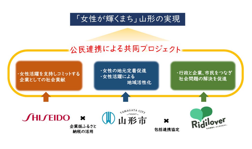 また、本プロジェクトでは「企業版ふるさと納税」を活用し、「女性活躍先進企業」である資生堂にご寄付いただくほか、事業自体にも全面協力いただきます。山形市内の経営者層に女性活躍の具体例・考え方をインプットするなど、資生堂がこれまで培ってきたノウハウを各プログラムに取り込んだ共同プロジェクトとなります。