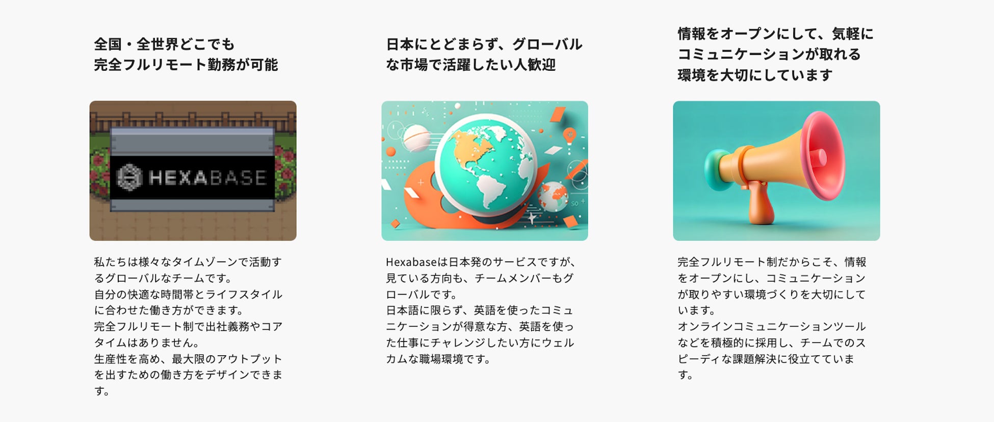 ヘキサベースでは、かねてより日本をはじめ、フィリピン、ベトナム、メキシコ、アメリカなど、国籍や居住エリアにとらわれず、様々なタイムゾーンで活動するグローバルなチーム作りをしてきました。『チームとメンバーの多様性を尊重する』これは、創業当初から私たちがずっと大切にしているバリューです。