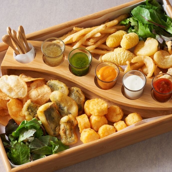 色々な種類のフライドポテト、フィッシュフライに加え、ディップするのは5種類のオリジナルソース。いつまでも飽きずに食べ続けられる、女子会など大人数での飲み会にぴったりのおつまみセット。