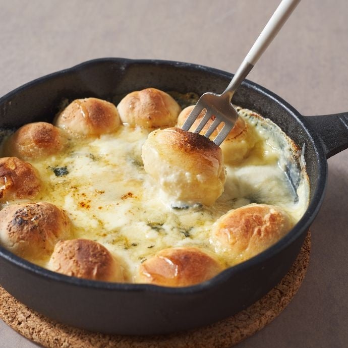 コロコロしたかわいいピザ生地をつまんで、とろとろになった4種のチーズをディップして食べる新感覚のダッチオーブンピザ。みんなでワイワイ楽しめる一皿です。