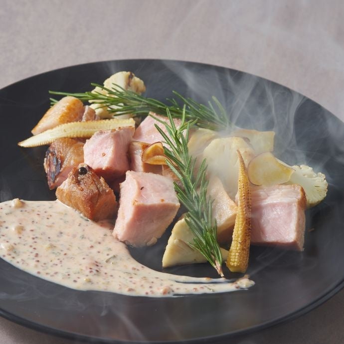 低温調理でジューシーに仕上げたローストポークをお客様の目の前で瞬間燻製する一皿。フタを開けた瞬間に広がるサクラチップスモークの香りが食欲をそそります。
