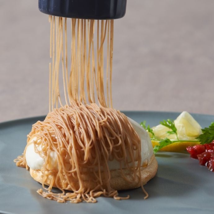 サクサクのメレンゲの上にアーモンドミルククリームを乗せた状態でご提供。仕上げにお客様ご自身でモンブランペーストを搾っていただき、出来立て0秒で食べることで香りの強いモンブランペーストの濃厚さと、メレンゲのサクサクの食感を楽しんでいただけるスイーツです。