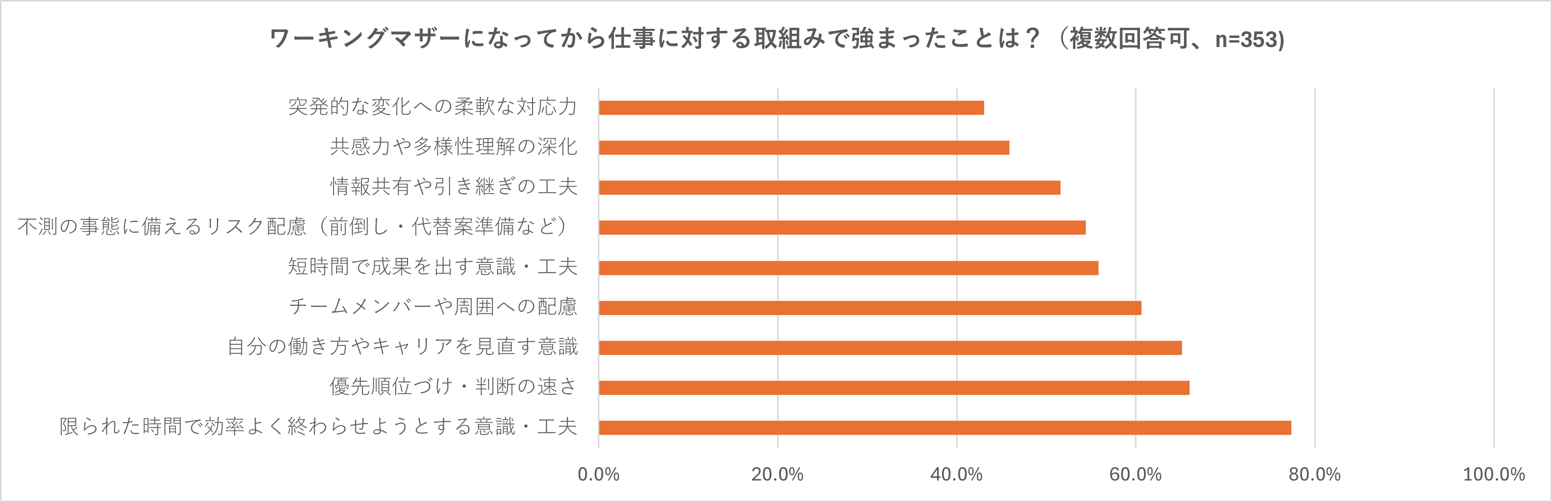 mogがワーキングマザーに独自に実施した調査※の中で、仕事の姿勢や取り組みについて聞いた設問において、77%が「限られた時間で効率よく終わらせる工夫」をしているほか、「短時間で成果を出す工夫」や「チームメンバーや周囲への配慮」を意識している人が50%以上を占めており、限られた時間で効率よく成果を出す生産性や、周囲とのコミュニケーションを意識した働き方をしていることが分かりました。 ※株式会社 mog ワーキングマザー生活実態調査に関するアンケート調査(2025)(インターネット調査、2025/09/26-2025/10/10、ワーキングマザー353人)