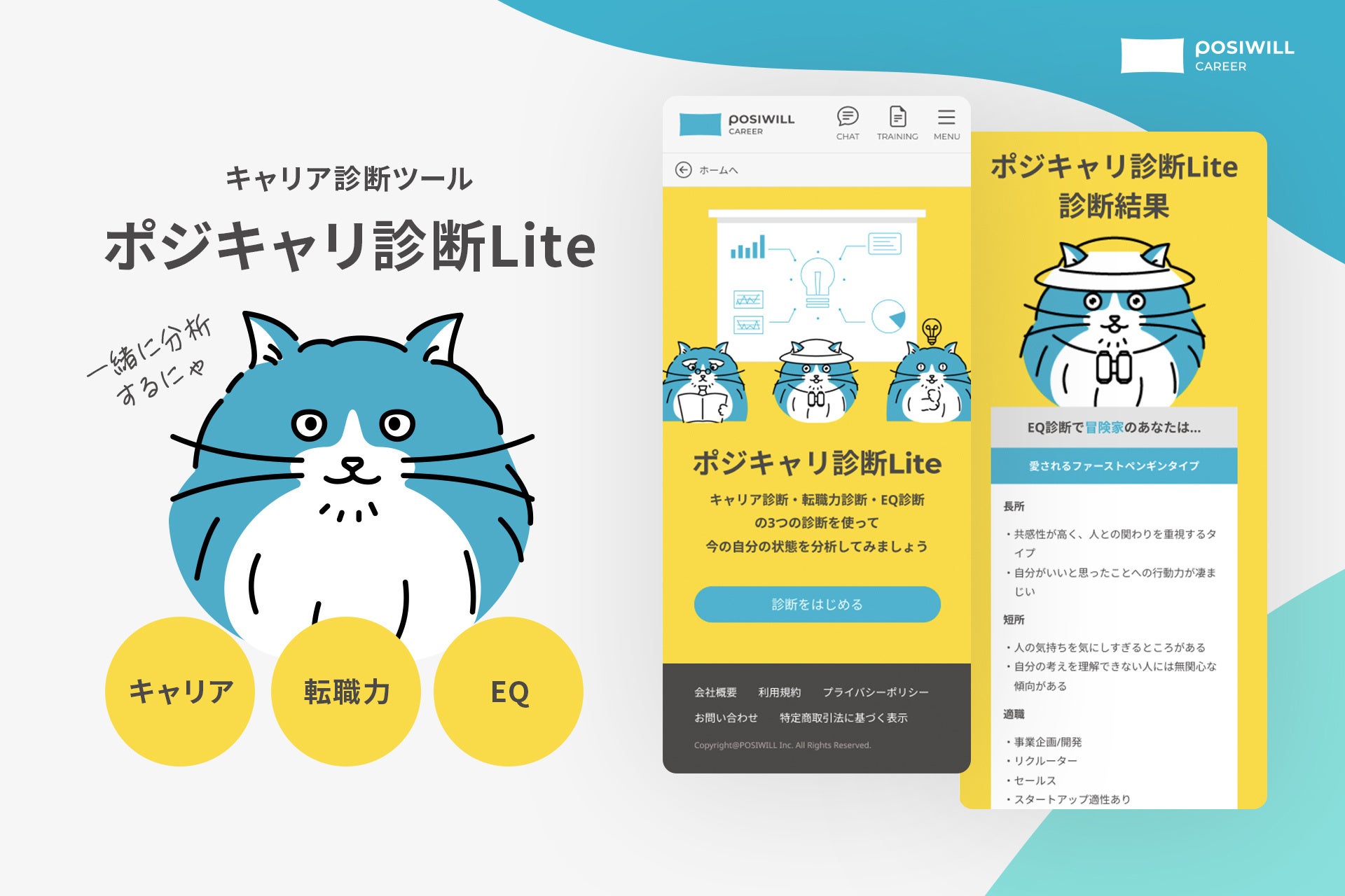 ポジウィル、キャリア診断ツール「ポジキャリ診断Lite」をEQカウンセラー大芝義信氏と共同開発。無料相談者向けに提供開始