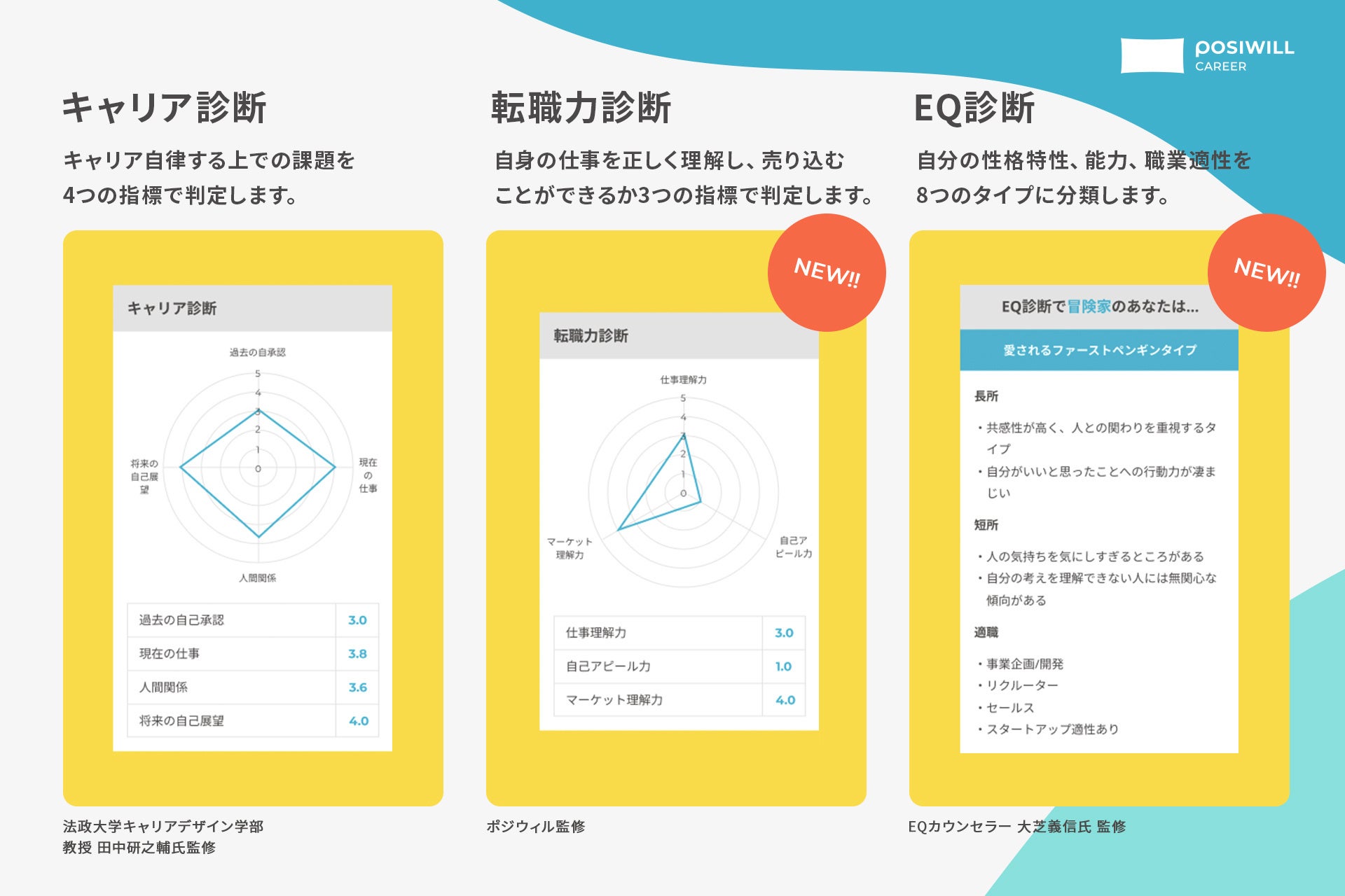 現在有料ユーザー向けに提供している、法政大学キャリアデザイン学部教授 田中研之輔氏監修の「ポジキャリ診断」に対し、ポジウィルが監修した「転職力診断」とEQカウンセラーである大芝義信氏が監修した「EQ診断」の要素を加え、新たに開発しました。