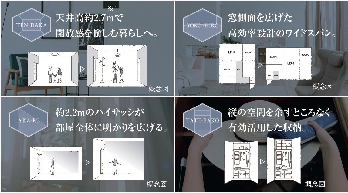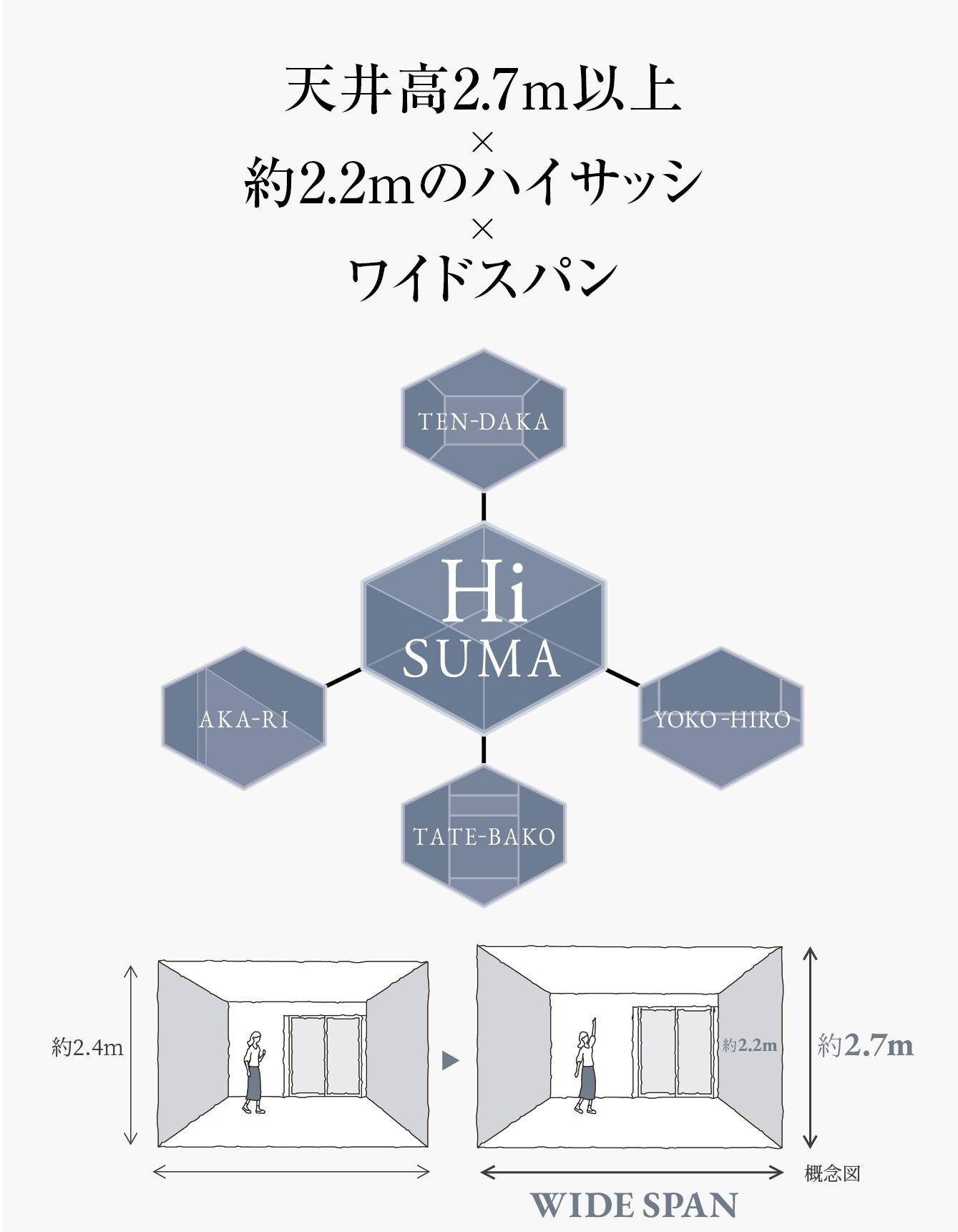 - 約2.7mの天井高、約2.2mのハイサッシ、ワイドスパンにより開放感を実現【空間設計「Hi/SUMA」】