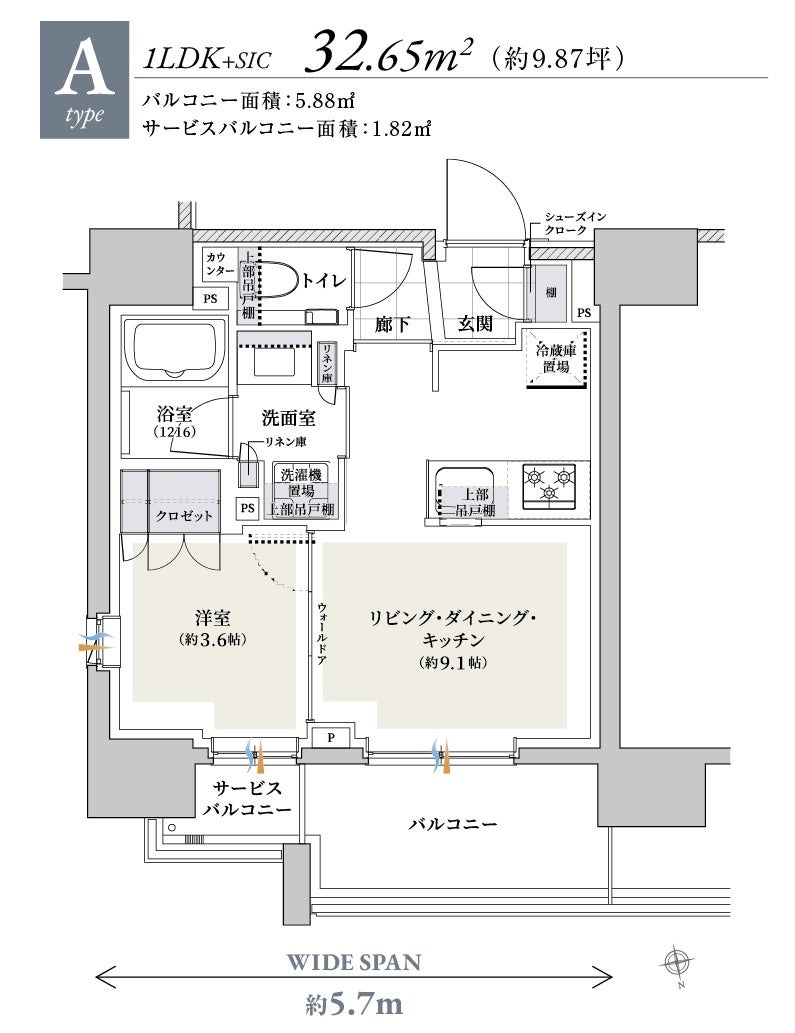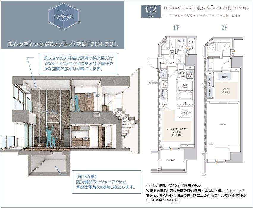 コロナ禍を経て在宅時間の増加により、おうち時間を充実させたいという傾向が強まる中、専有面積が限られる都心マンションの居住スペースを、いかに快適な住まいとするか検討を重ねた結果、“開放感”に着目。全住戸、天井高2.7m以上、約2.2mのハイサッシ、ワイドスパンとし、縦の空間の充実を図ることで、開放感や採光性を高めるとともに、通常よりも高さがある造作収納の設置も実現しました。また、2層分の階高を活かしたメゾネットタイプの住戸は、吹き抜け部分の天井高が約5.9mとマンションの領域を超えた開放感を味わうことができ、さらにフロアが分かれているためプライベートと仕事で使い分けが可能です。また、季節家電の収納にも便利な床下収納もあり、機能面も大きな魅力です。