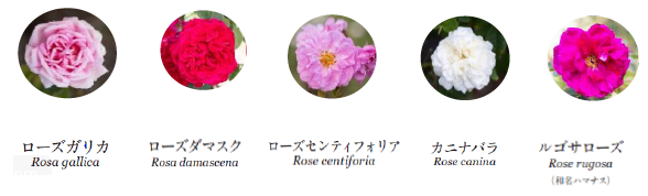 *ローズガリカ、ローズダマスク、ローズセンティフォリア、カニナバラ、ルゴサローズ(和名ハマナス)