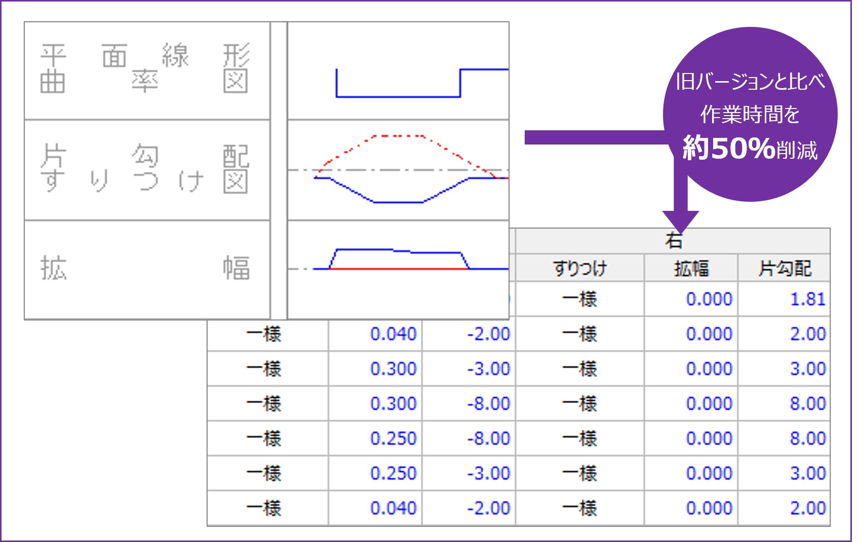 縦断図から測点名・追加距離等を取得する際の動作を改良いたします。ワンクリックで、対象となる縦断表の項目欄を指定することが可能です。また、縦断表内の片勾配や拡幅の数値を、自動で取得するよう改良いたします。