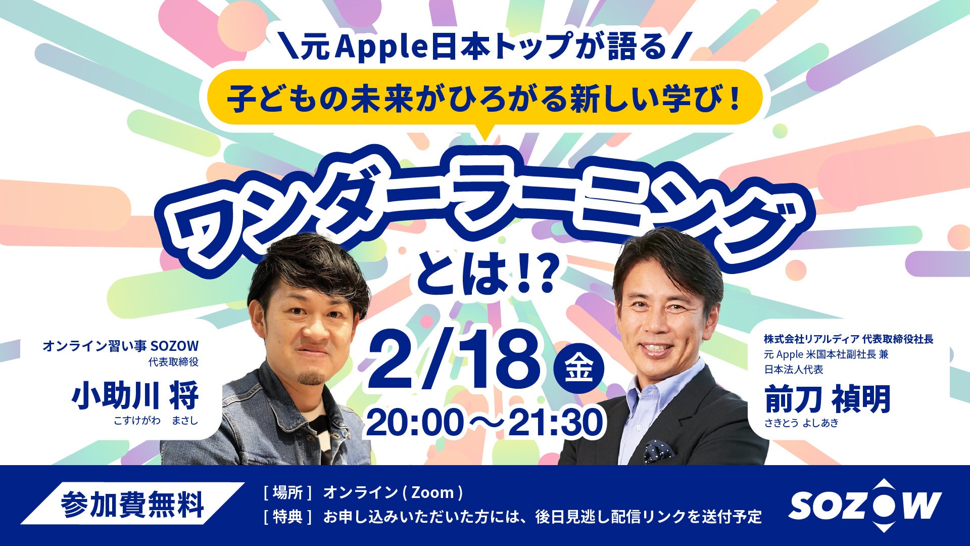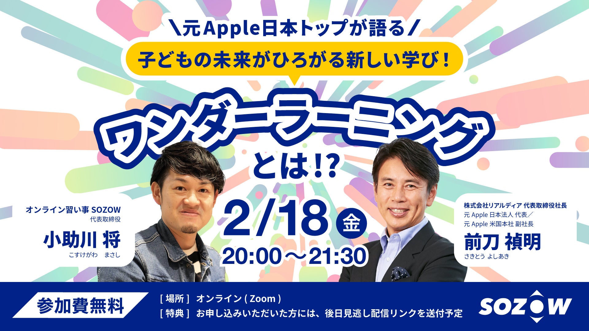 Go Visions株式会社(所在地:東京都品川区、代表取締役:小助川 将)が運営する小・中学生向けオンラインの学び場「SOZOW(ソーゾウ)」は、2022年2月18日(金)に元Apple日本法人代表・前刀禎明氏をお招きし、"子どもの未来が広がる新しい学び"をテーマにした保護者向けセミナーを開催いたします。