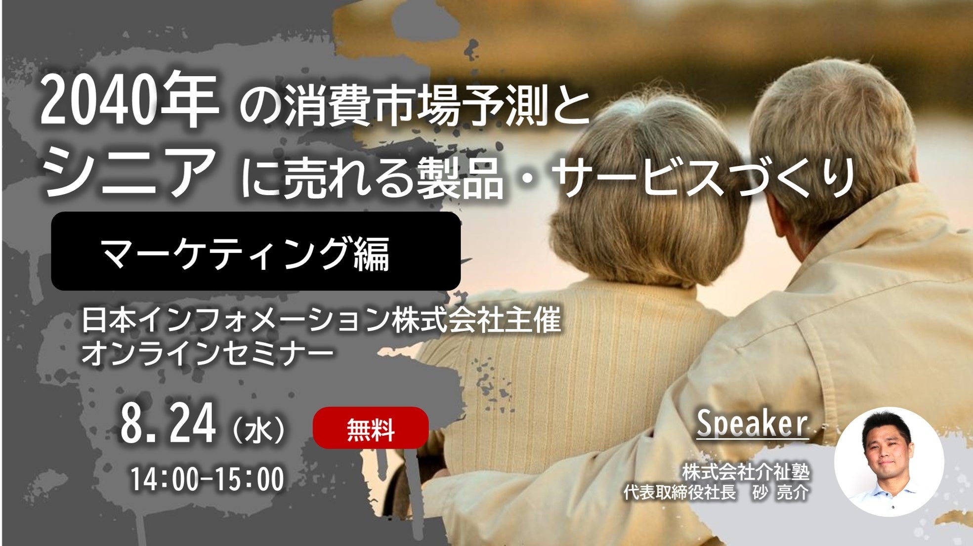 シニアに精通した有識者より知見や事例をご紹介いただき、シニアへのマーケティングやコミュニケーションのアプローチのヒントを探るセミナーを実施致します。後半は介護現場を通じたシニアインサイト探索に繋がる手法など、シニアへのリサーチアプローチをご紹介します。日本インフォメーション株式会社(代表取締役社長:斎藤 啓太)主催、ゲストに株式会社介祉塾 代表取締役社長 砂 亮介氏をお招きして開催致します。