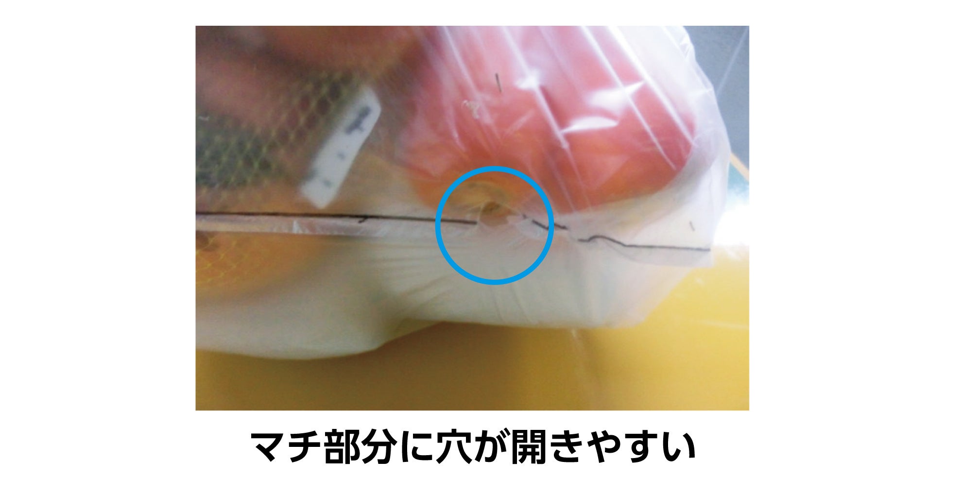 レジ袋は、中身を入れたときに2枚と4枚(マチ部)の境界部に負荷が集中し、破れやすくなります。