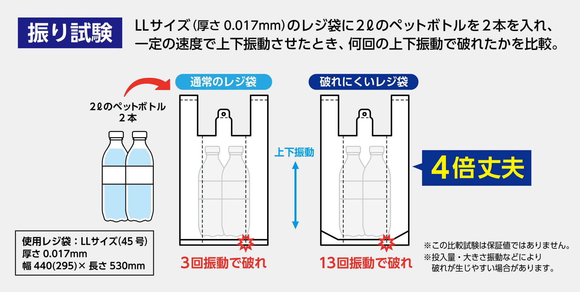 ポリ袋にペットボトルを入れ、上下に一定の速度で振り、振動を与える試験(独自試験法)で、通常の袋に比べ強度が約4倍になりました。