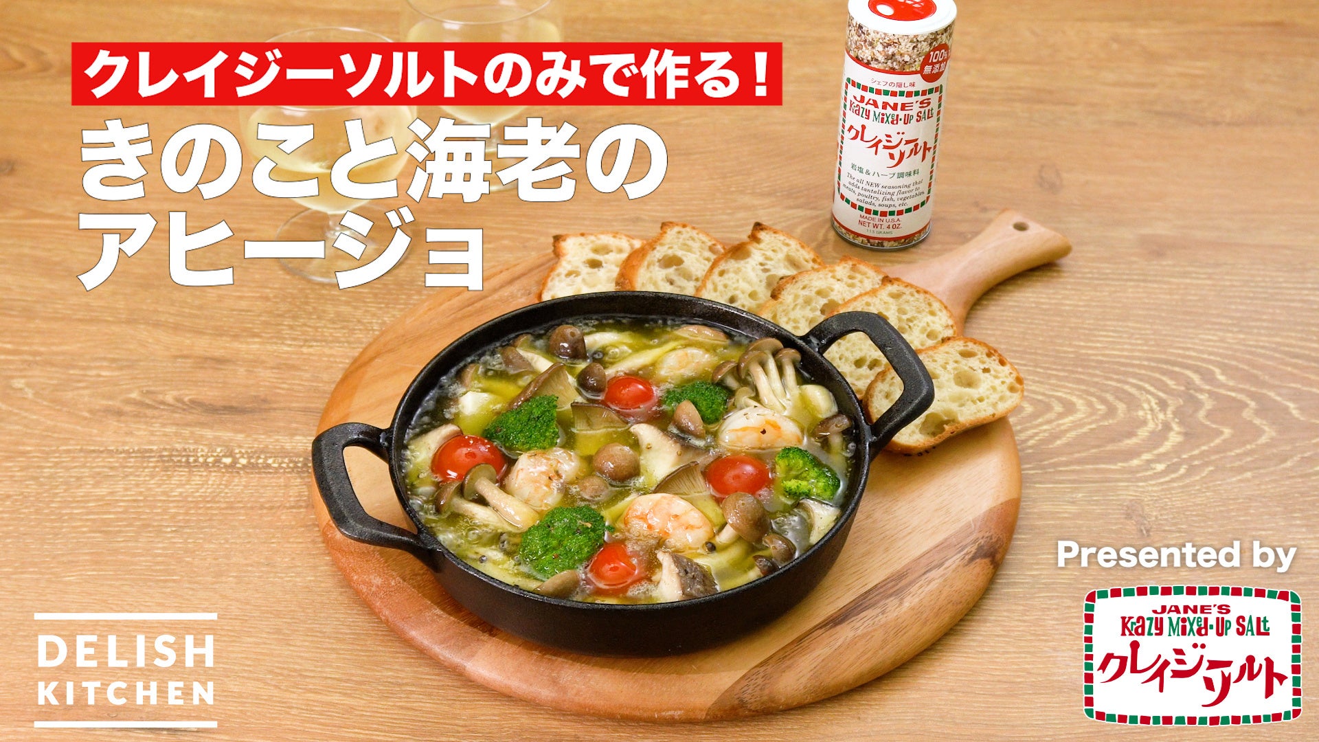 レシピ動画『クレイジーソルトのみで作る!きのこと海老のアヒージョ』
