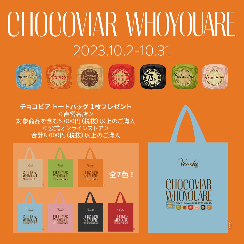 「チョコビア」ファミリーの新作誕生を記念し、10月2日(月)~10月31日(火)の期間、「CHOCOVIAR WHOYOUARE」キャンペーンとして、直営各店と公式オンラインストアで、「チョコビア」カラーのオリジナルトートバッグをプレゼントします。プレゼントの条件についてはキャンペーン詳細をご確認ください。