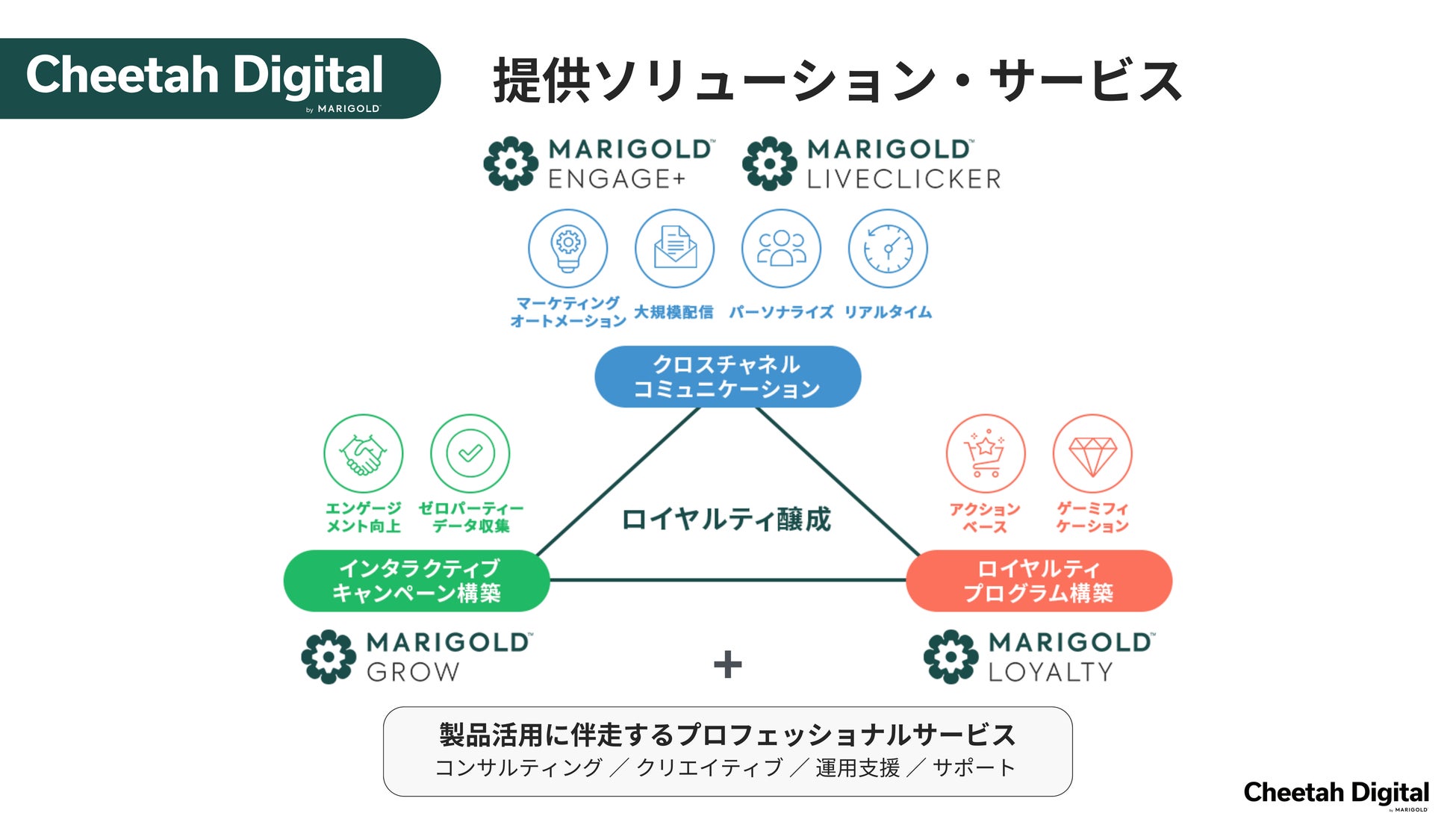 チーターデジタル株式会社は、全世界で40,000以上のグローバル ブランドに対して、マーケティングテクノロジーを提供するMARIGOLD(マリーゴールド)グループに所属しています。日本では、Marigold Engage+(マーケティングオートメーションツール)、Marigold Loyalty(ロイヤルティプログラム管理ソリューション)、Marigold Grow(インタラクティブキャンペーン管理ツール)、Marigold Liveclicker (動的パーソナライズコンテンツ生成ツール)の4製品を提供。ソリューションに加え、コンサルティング・制作・運用などのプロフェッショナルサービスを強みとし、企業のパーソナライズされたブランド体験提供を支援しています。