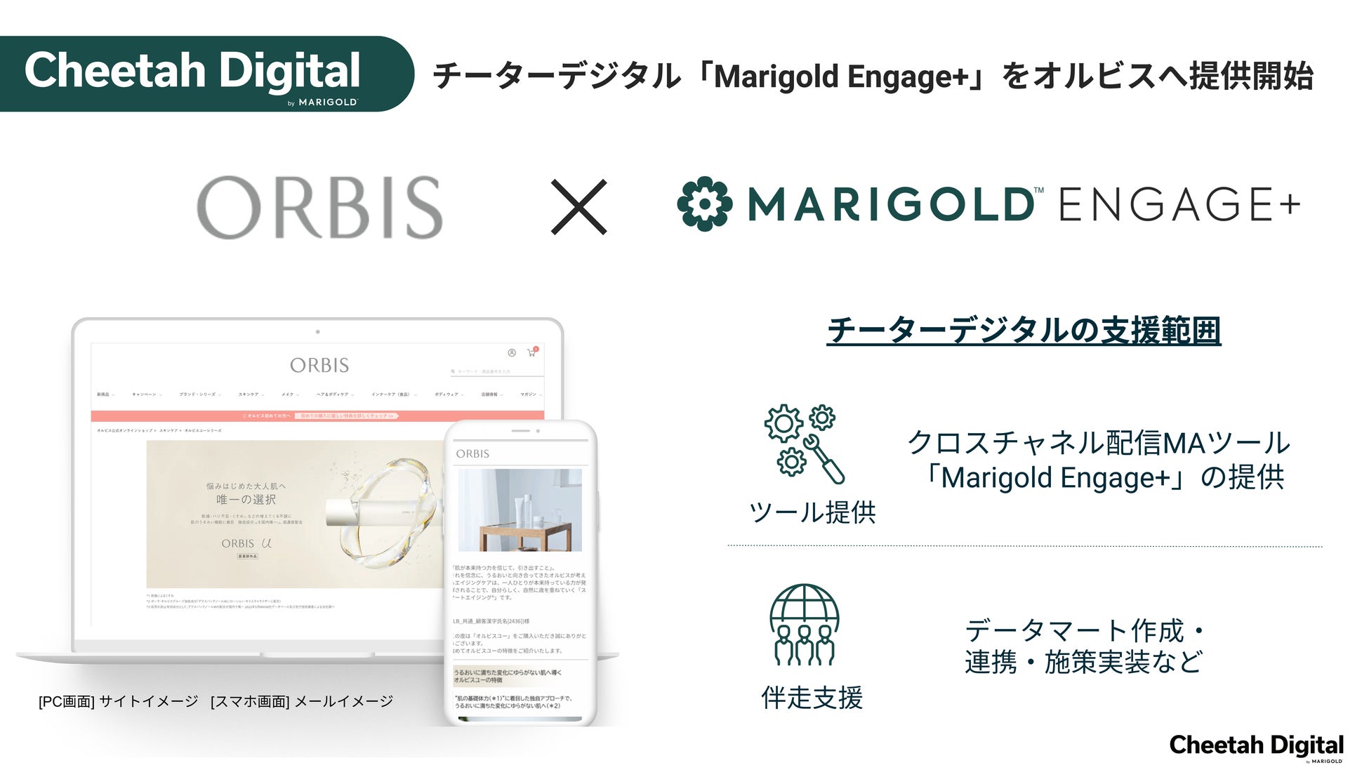 マーケティングテクノロジーを提供するチーターデジタル株式会社(本社:東京都港区、代表取締役社長:瀧本(浅坂)絵美、以下: チーターデジタル)は、ビューティーブランド「ORBIS(オルビス)」を展開するオルビス株式会社(本社:東京都品川区、代表取締役社長:山口 裕絵、以下: オルビス)へ、MAツール「Marigold Engage+」の提供を開始しました。