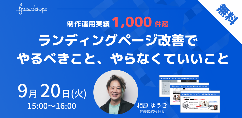 株式会社free web hope(本社:東京都千代田区、代表取締役:相原ゆうき)は、無料のオンラインセミナー「制作運用実績1,000件超 ランディングページ改善でやるべきこと、やらなくてよいこと」を9月20日(火)に開催いたします。(申し込み先:https://bit.ly/3Bdr7Ay)
