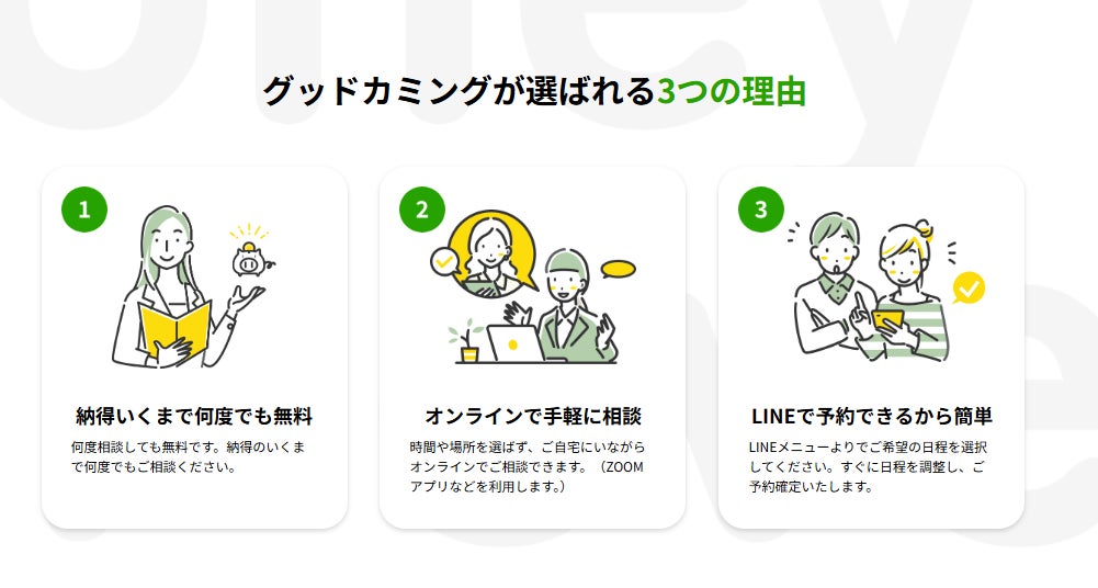 「グッドカミング」はWeb上で保険の比較・検討・申し込みが完結するサービスです。FPへ気軽に相談できる「保険のオンライン無料相談」、一から保険・お金について学べる記事コンテンツも併せて提供しています。保険選びにおけるお客様の課題解決のみにとどまらず、「お金の不安を解消し、より豊かな人生を実現するためのサポート」を達成するのが、グッドカミングの目標です。