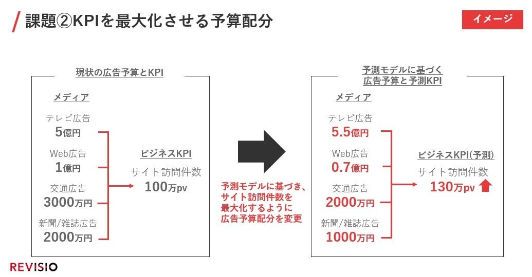 REVISIOでは、すでにあるモデルの活用ではなく各社にフィットした透明性のあるモデルを作成の上、広報・広告活動における最適なマスとデジタルの予算配分を算出します。(図は次頁参照)