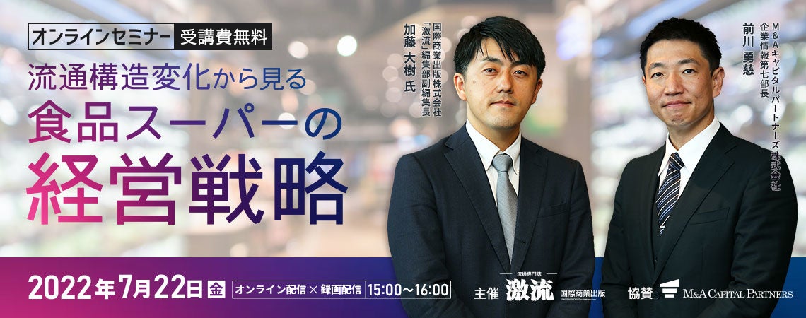 M&Aキャピタルパートナーズ株式会社(東京都千代田区・代表取締役社長 中村悟)は、無料オンラインセミナー「流通構造変化から見る食品スーパーの経営戦略(主催:国際商業出版株式会社「激流」、協賛:M&Aキャピタルパートナーズ株式会社)」を2022年7月22日(金)15:00~16:00に開催いたします。