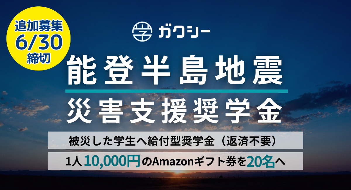 今年1月3日より、募集した奨学金協賛の中でも、個人からの寄附募集により設立された『能登半島地震災害支援奨学金』(1人1万円)。今回20名の追加募集が決定しました。被災した学生がいち早く生活に必要な品を手に入れられるようAmazonギフト券で給付し、6月末日までガクシーサイトで応募受付中です。