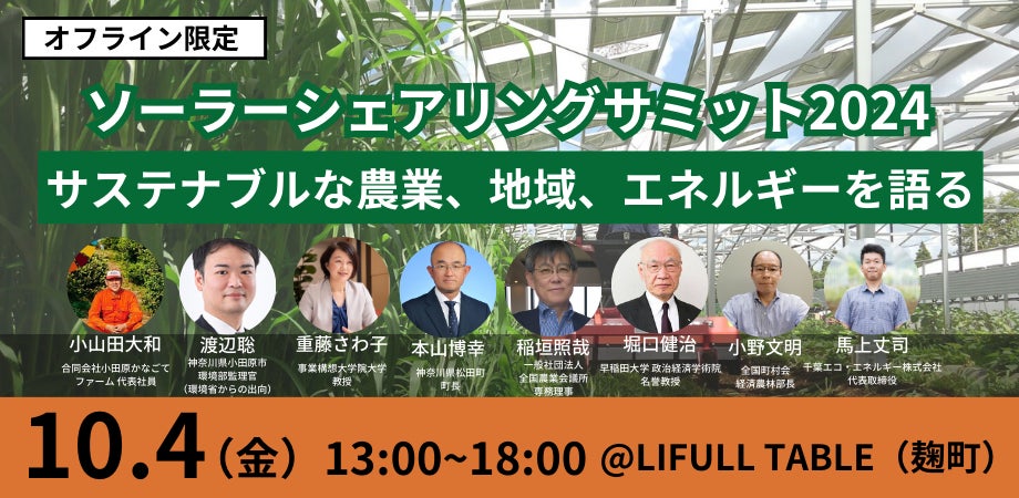 2013年より営農型太陽光発電に取り組み、国内外で450件以上のコンサルティング実績を持つ千葉エコ・エネルギー株式会社(本社:千葉県千葉市、代表取締役:馬上丈司)と神奈川県内で営農型太陽光発電事業に取り組む合同会社小田原かなごてファーム(本社:神奈川県小田原市、代表社員:小山田大和)は、2024年10月4日(金)、サステナブルな農業、地域、エネルギーを語るオフラインイベント「ソーラーシェアリングサミット2024」を開催いたします。