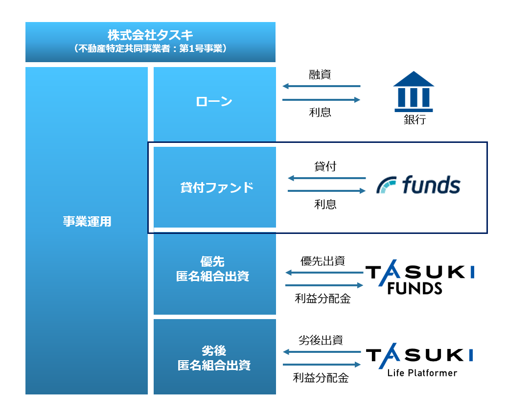 タスキは、「TASUKI FUNDS」を通じて、不動産特定共同事業法に基づいたクラウドファンディングを運用しております。また、ファンズ社は1円から貸付投資ができる「Funds(ファンズ)」を運営し、個人投資家の方にさまざまな企業への投資機会の創出を行っています。