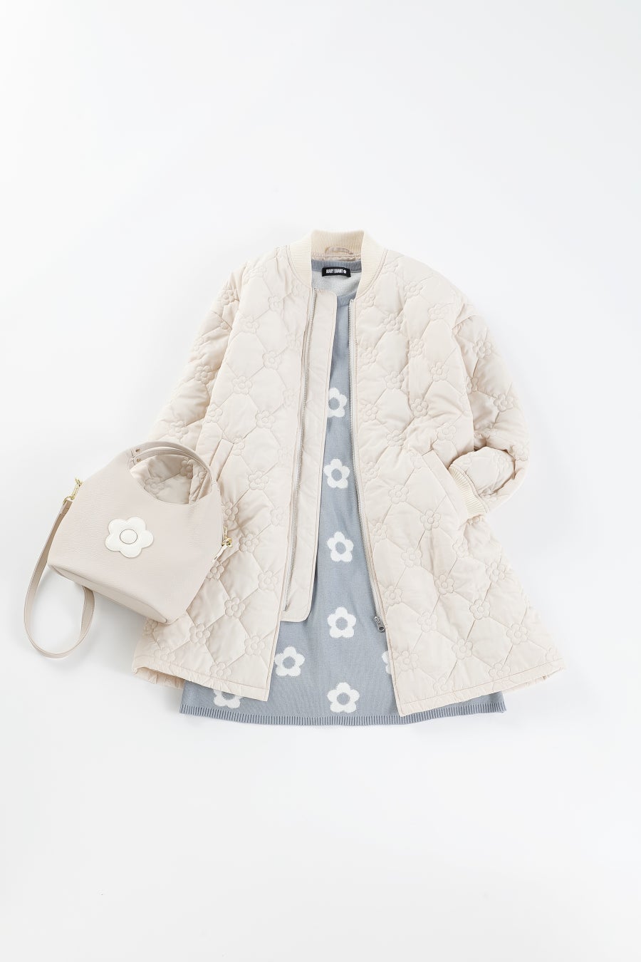 デイジーのキルト柄ブルゾンに、総柄のワンピースあわせたガーリーコーデ。