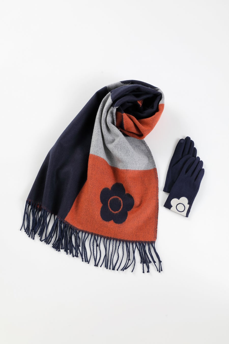 大判のストールはシックなネイビーにオレンジを効かせたスタイリッシュなデザイン。