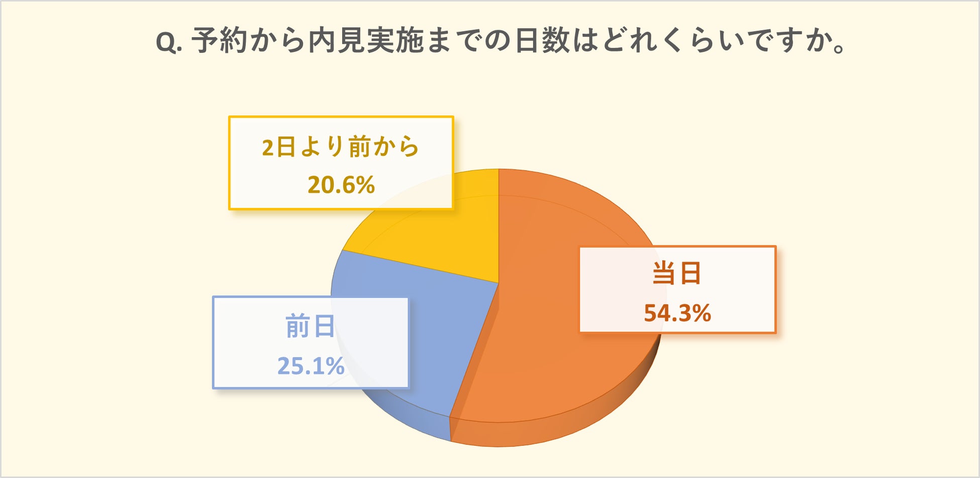 続いて多いのがおよそ4人に1人が実施した「前日」予約(25.1%)です。スマビューなら不動産会社閉店後の内見前日夜遅くでもオンラインで気軽な予約ができることも、前日予約をされた方が多い理由の一つです。