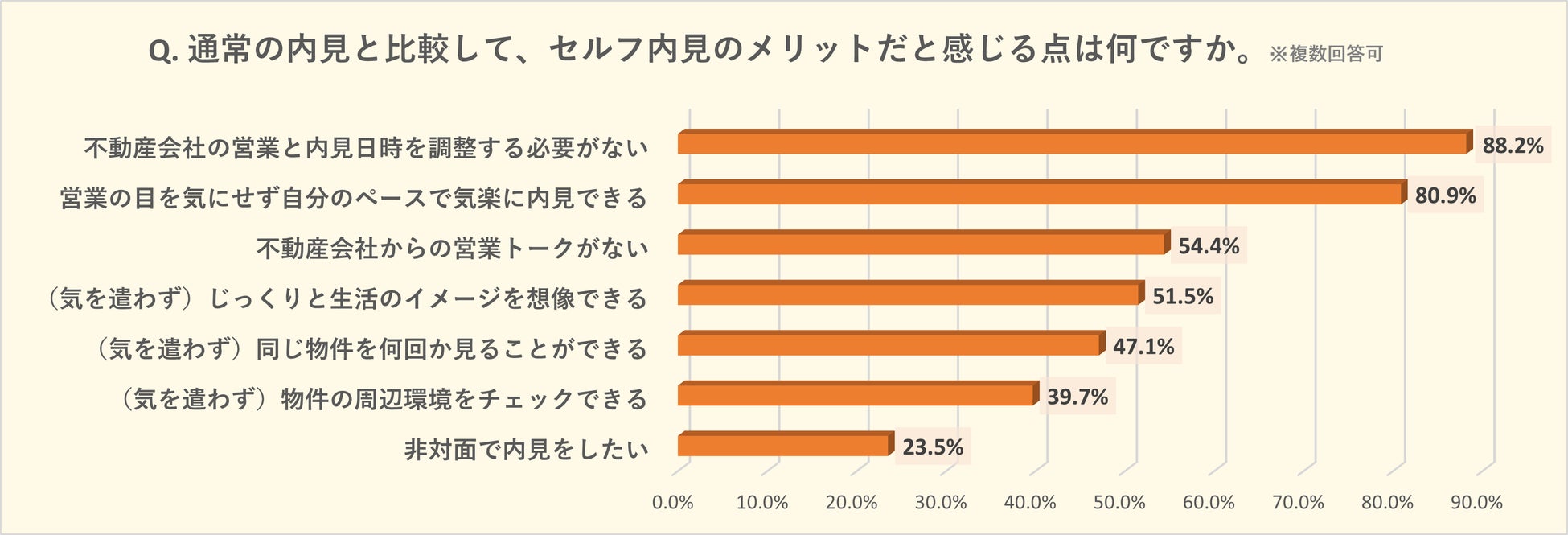 セルフ内見を行うメリットの上位にランクインした項目は「内見日時を調整する必要がない」88.2%、「営業の目を気にせず自分のペースで気楽に内見できる」80.9%、「不動産会社からの営業トークがない」54.4%、という営業担当とのコミュニケーションの有無に関する項目がTOP3となりました。