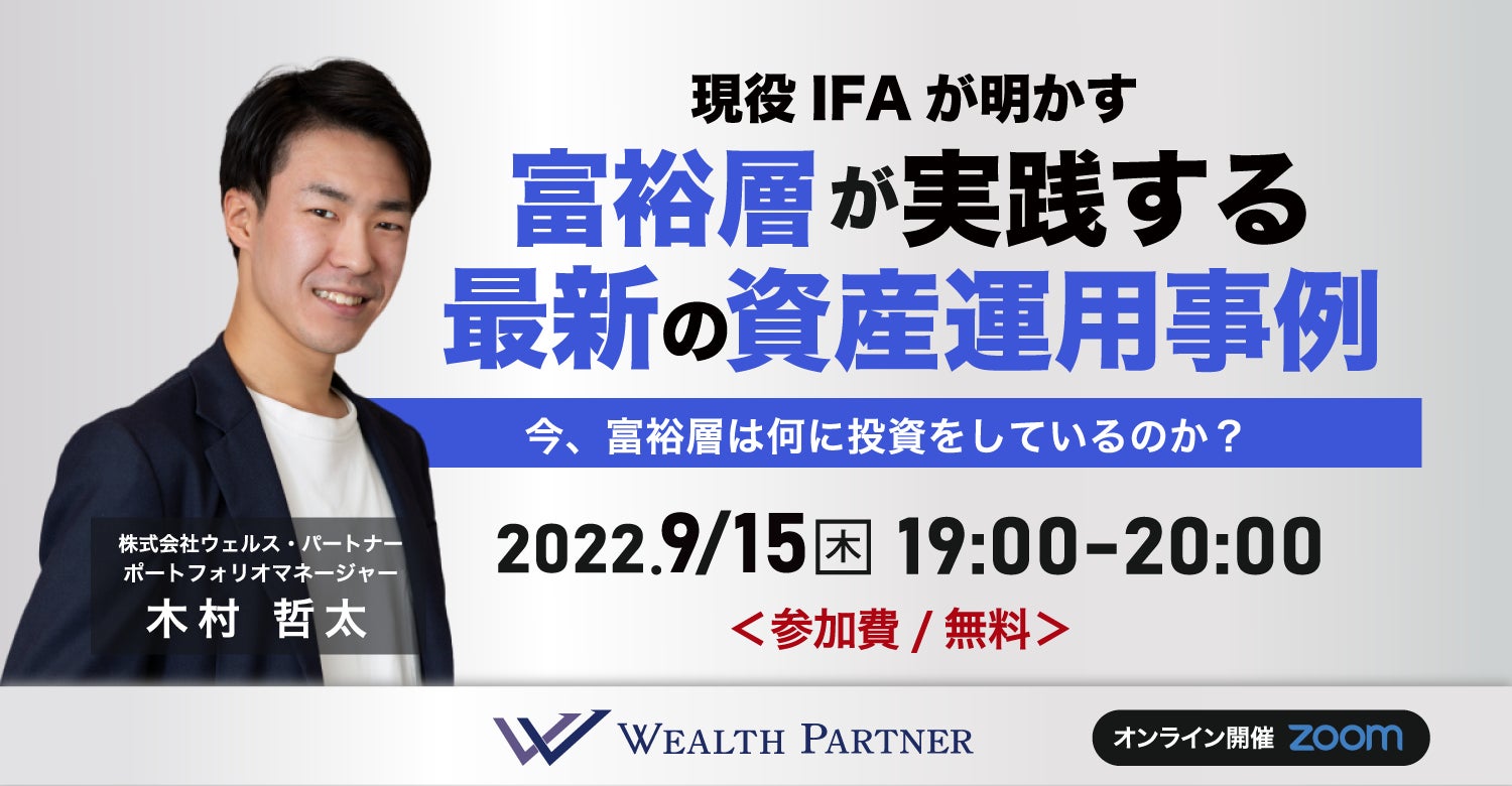 富裕層向けにIFA事業始め、資産運用のコンサルティングを行う株式会社ウェルス・パートナー(代表取締役:世古口俊介、本社:東京都港区、以下「当社」)は、オンラインセミナー「現役IFAが明かす富裕層が実践する最新の資産運用事例」を2022年9月15日(木)19:00〜20:00に開催いたします。