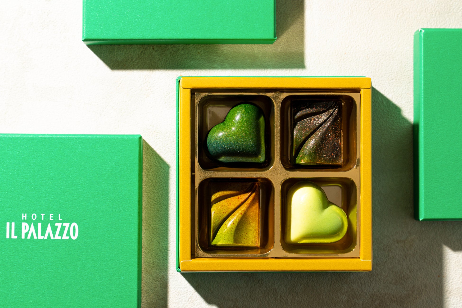 HOTEL IL PALAZZOが歩んできた歴史と、Re-Designにより生まれた新たな感性を融合させ、「伝統と革新が響き合う、五感で味わうショコラの物語」をテーマに、季節ごとに異なる4粒のチョコレートを詰め合わせた限定BOXをご用意。