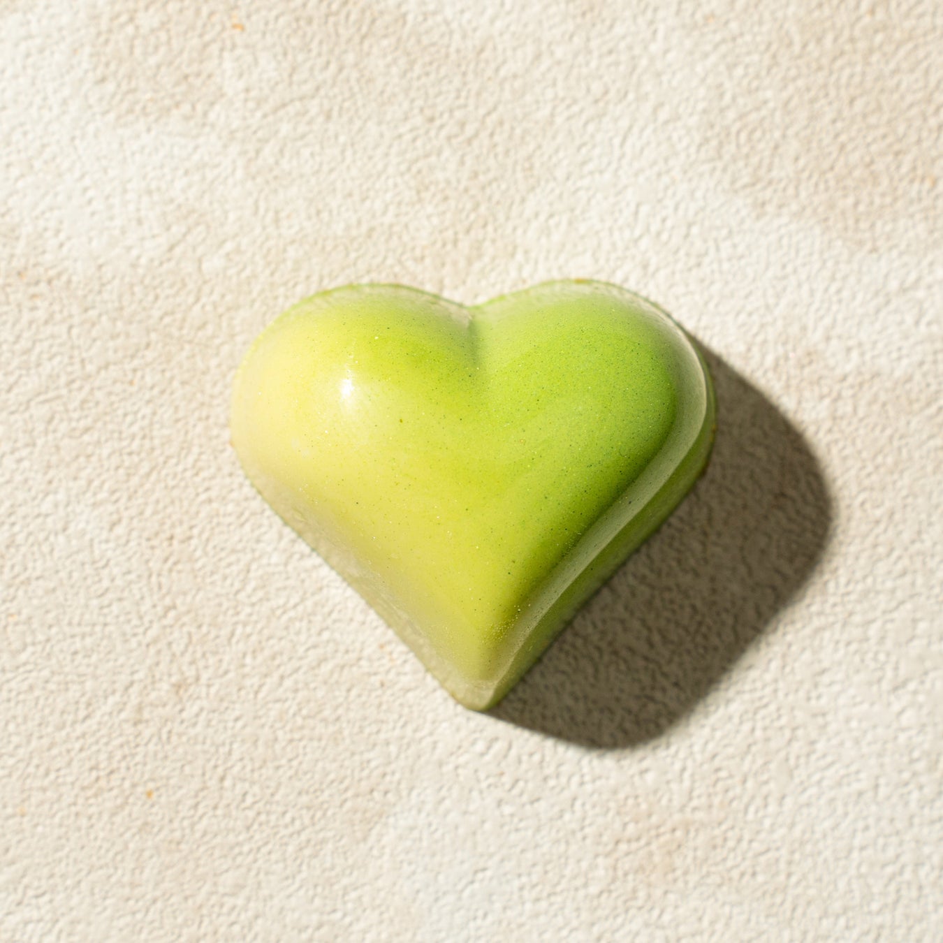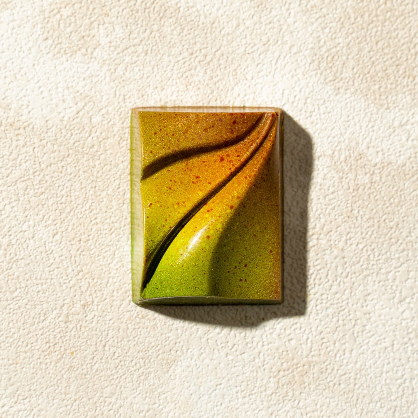 八女産の抹茶を使用した生キャラメルとガナッシュの二層仕立て。上層には、抹茶の豊かな風味を引き立てるため浅めにキャラメリゼした抹茶キャラメルを、下層には、バナナやパッションフルーツなどの夏果実と新茶を合わせた爽やかなガナッシュを閉じ込めました。