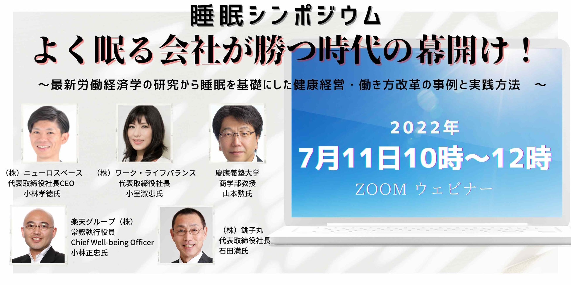 こうした研究の成果を企業経営に新しい視点として取り入れることが急がれるため、今回、株式会社ニューロスペース主催で「【睡眠シンポジウム2022】よく眠る会社が勝つ時代の幕開け!〜最新労働経済学の研究から睡眠を基礎にした健康経営・働き方改革の事例と実践方法〜」が開催されるはこびとなりました。