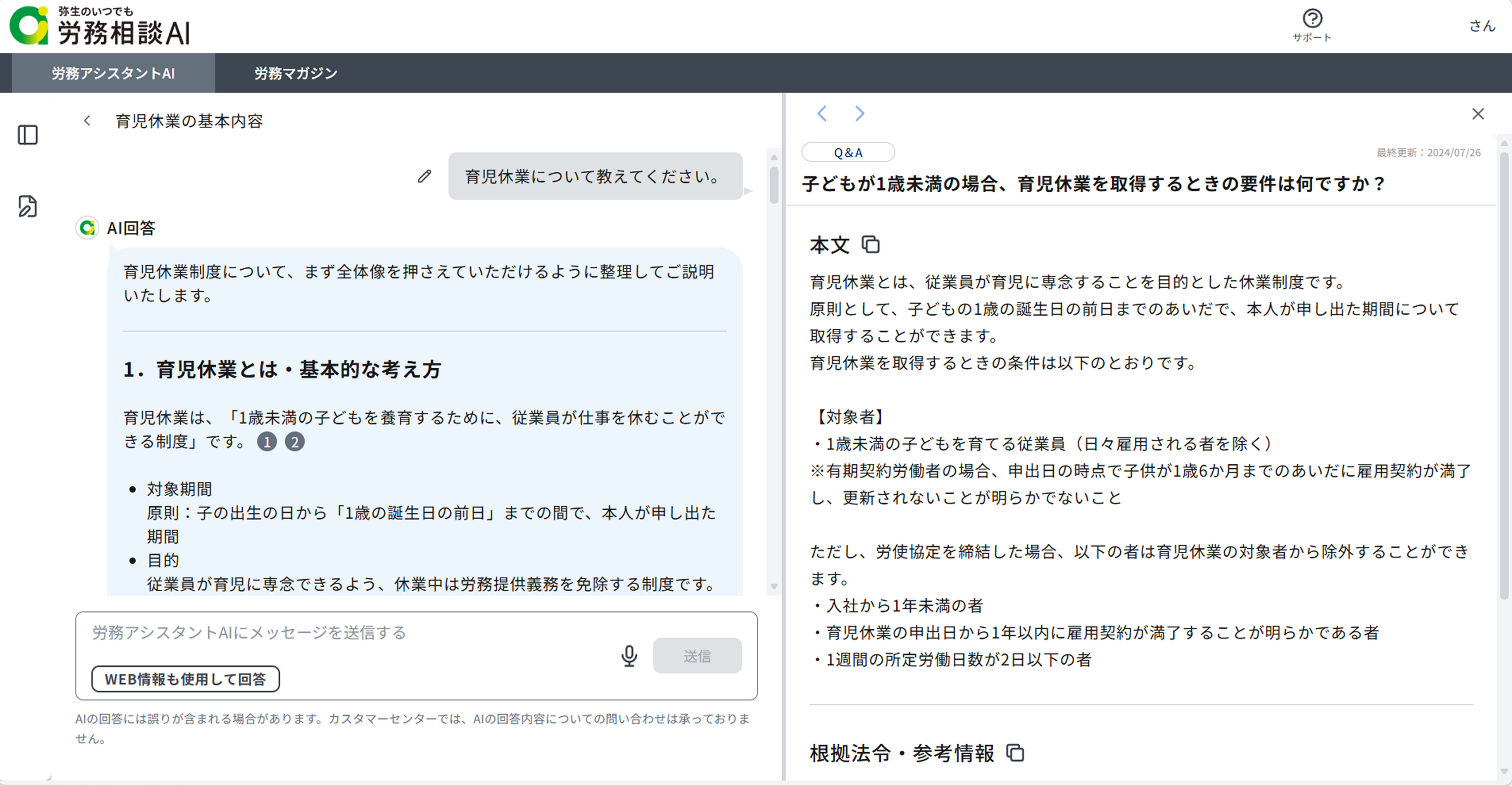 労務相談に加え、「弥生給与 Next」「弥生勤怠 Next」「弥生労務 Next」における操作・設定方法を法令・制度の観点から解説とセットで確認することが可能です 。弥生ユーザーの業務フローに即した形で、AIによるサポートを提供します。