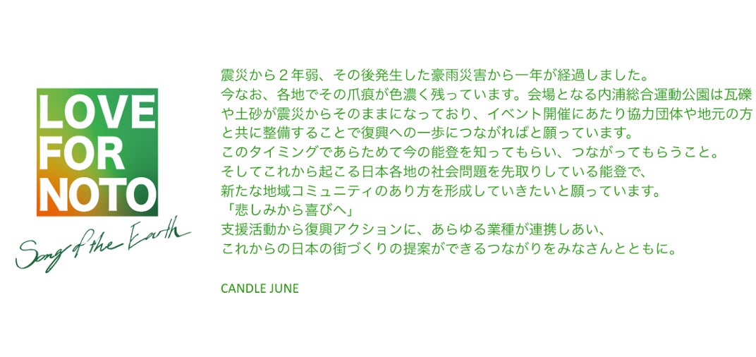 2026年6月末には東京代々木公園での「LOVE FOR NOTO Song of the Earth 2026」開催も決定。一人でも多くの方に能登のリアルを感じて伝えてもらうために。東京、能登それぞれの会場で震災と豪雨災害からの復興過程と能登の今を紹介していきます。
