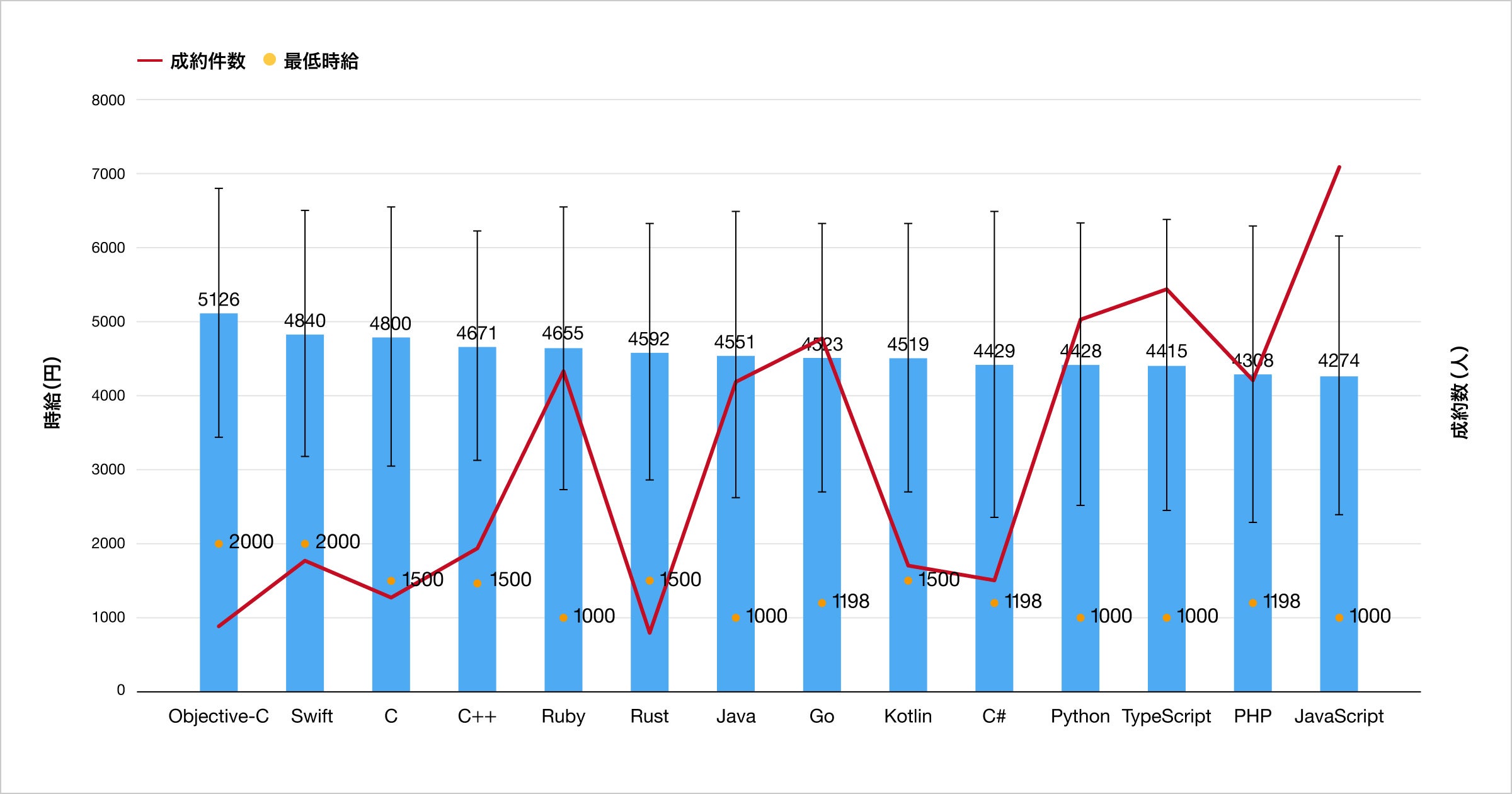 平均時給を降順に並べた場合、Objective-C、Swift、C、C++、Ruby、Rust、Java、Go、Kotlinと並びます。