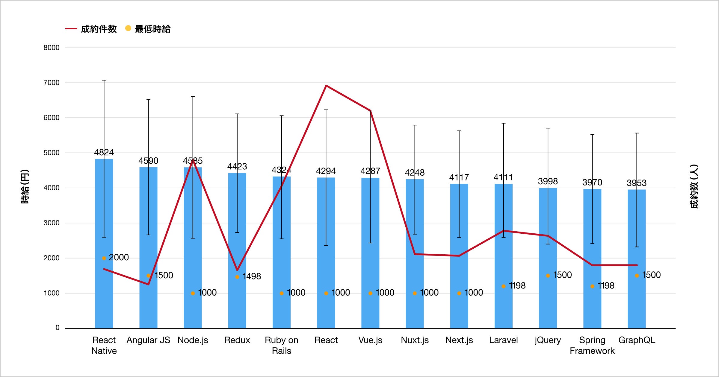 平均時給を降順に並べた場合、React Native、AngularJS、Node.js、Redux、Ruby on Rails、React、Vue.jsと続きます。React、Vue.js、Nuxt.js、Next.jsの平均時給については4,200円前後であり、差は小さいと言えます。