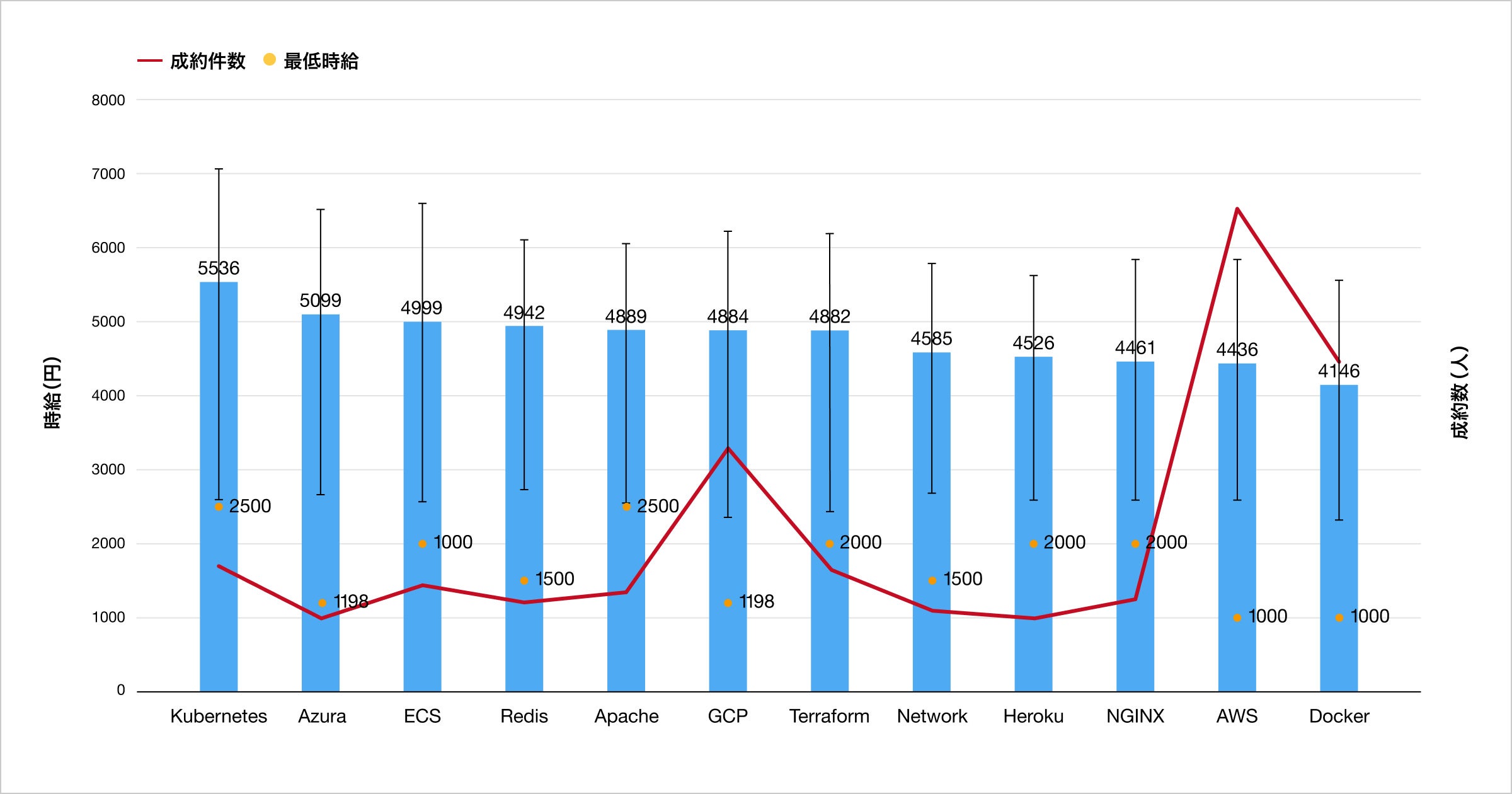 平均時給を降順に並べた場合、Kubernetes、ECS、Dockerといったコンテナ技術や、TerraformのようなIaC(Infrastructure as a Code)が目立ちます。中途採用の場を見てもまだまだ経験者が少ないために高額になるケースがあります。