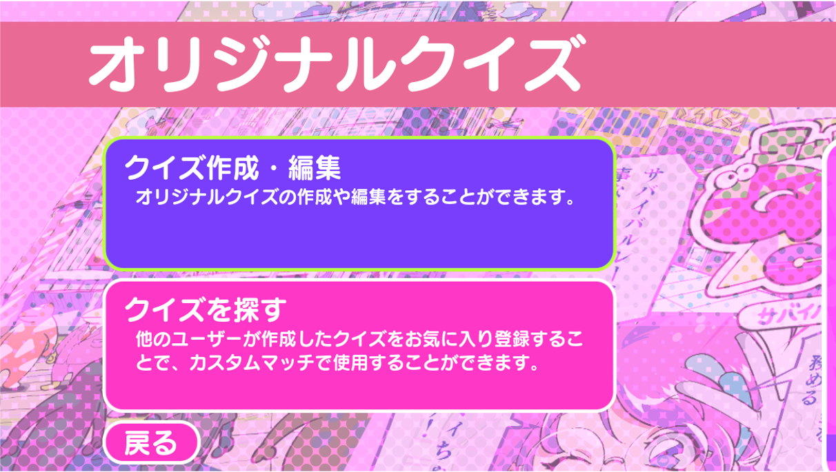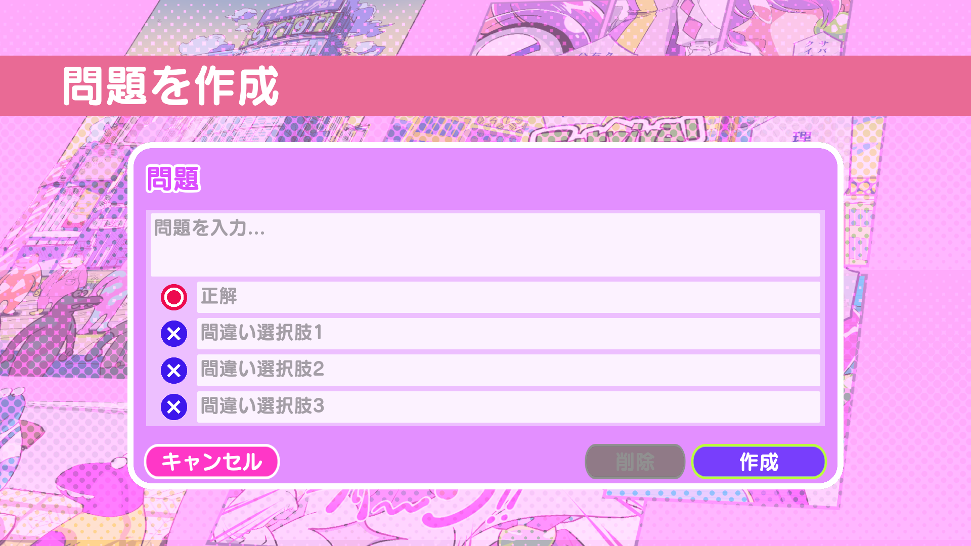 プレイヤーが好きにクイズを作成し、ゲーム内(*)で出題させて遊ぶことができます。 (*カスタムマッチ)