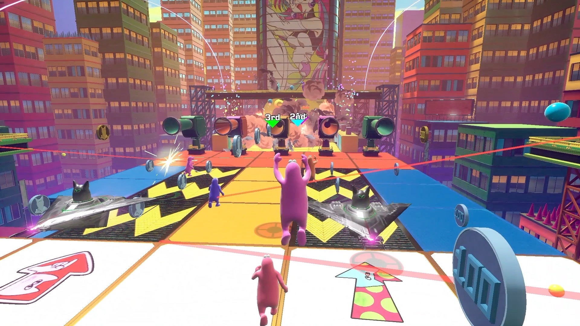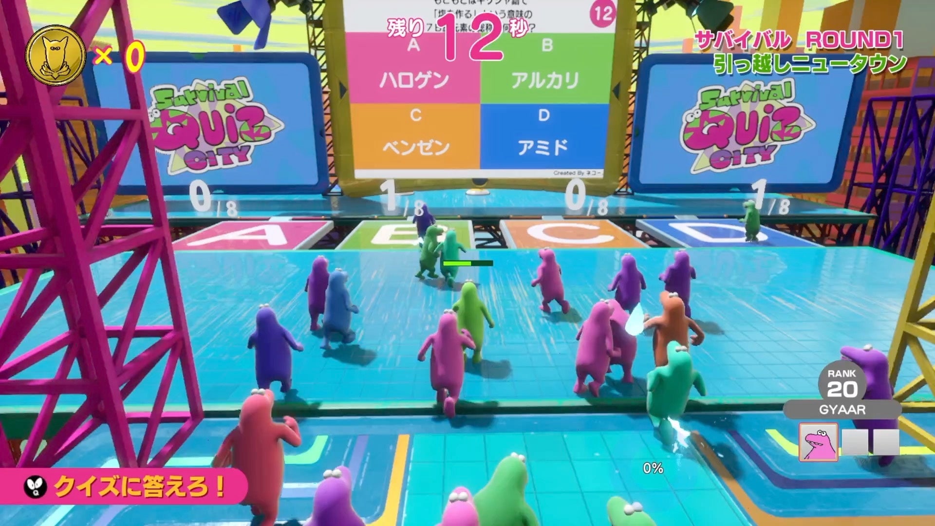 このCITYの住民たちが楽しむサバイバルクイズ、それは、なかなかに理不尽なサバイバルバトルアクションゲームなのです・・・。クイズの正解者となれば勝ち組として高みに立ち、負け組は厳しい立場から勝ち上がりを狙い、目指すは栄光の優勝!オンライン×大人数でわちゃわちゃ!栄光の優勝を目指し、ラウンドを重ねて競い合いながら遊びます。