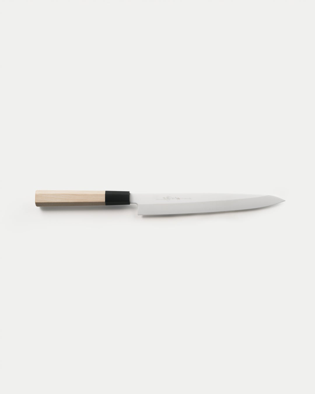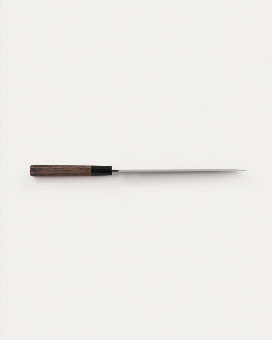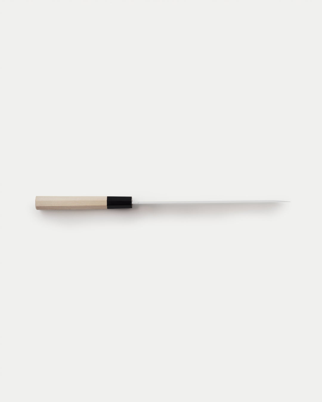 「matou -磨刀-」では、七寸柳(215mm)のサイズを採用。日本の一般的なキッチンで扱いやすいサイズ感を考慮 して設計。市販の包丁スタンドにも収まる長さであるため、 刺身包丁を初めてご購入する方にも保存場所に困らないサイズ感。柄には伝統的な「水牛柄」を採用。口輪に水牛の角、持ち手には木材が使用されている木柄のこと。水牛の角と木材が近しい柔らかさであるため、長年使っていても その境目に段差が付きにくいという利点がある。使っていくうちに自分の握り心地に合わせて経年変化していく。