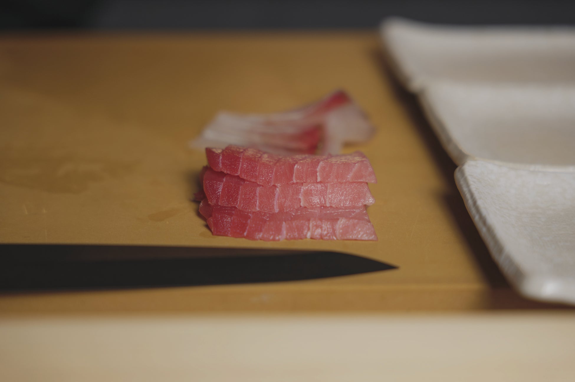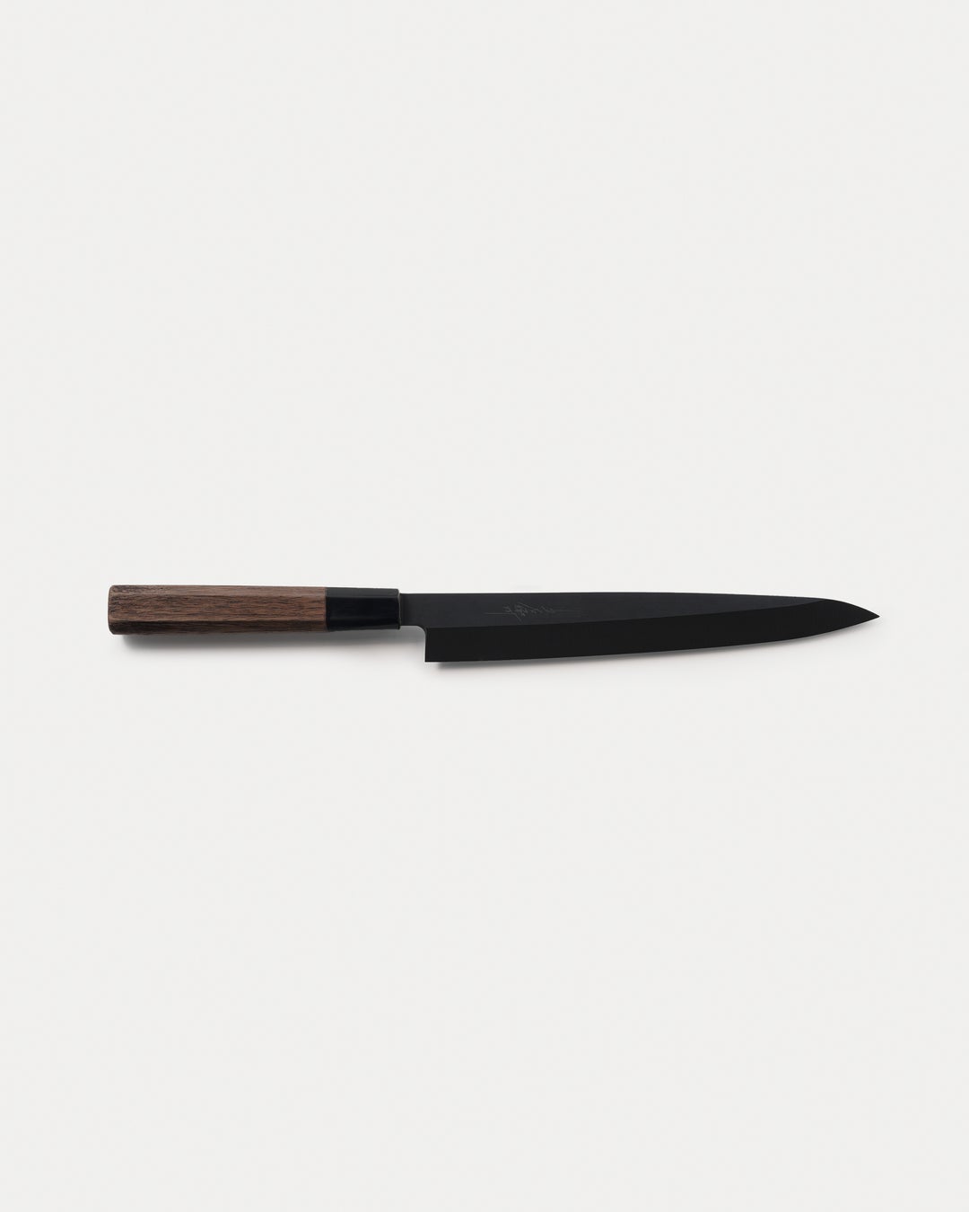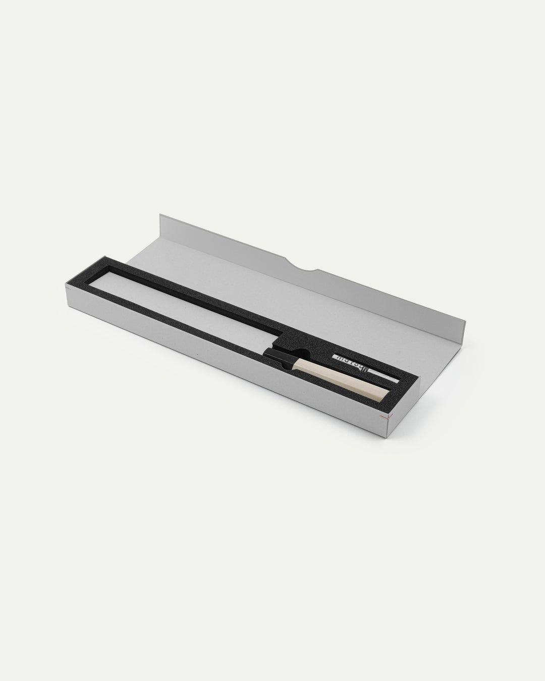 「matou -磨刀-」では、七寸柳(215mm)のサイズを採用。日本の一般的なキッチンで扱いやすいサイズ感を考慮 して設計。市販の包丁スタンドにも収まる長さであるため、 刺身包丁を初めてご購入する方にも保存場所に困らないサイズ感。柄には伝統的な「水牛柄」を採用。口輪に水牛の角、持ち手には木材が使用されている木柄のこと。水牛の角と木材が近しい柔らかさであるため、長年使っていても その境目に段差が付きにくいという利点がある。使っていくうちに自分の握り心地に合わせて経年変化していく。