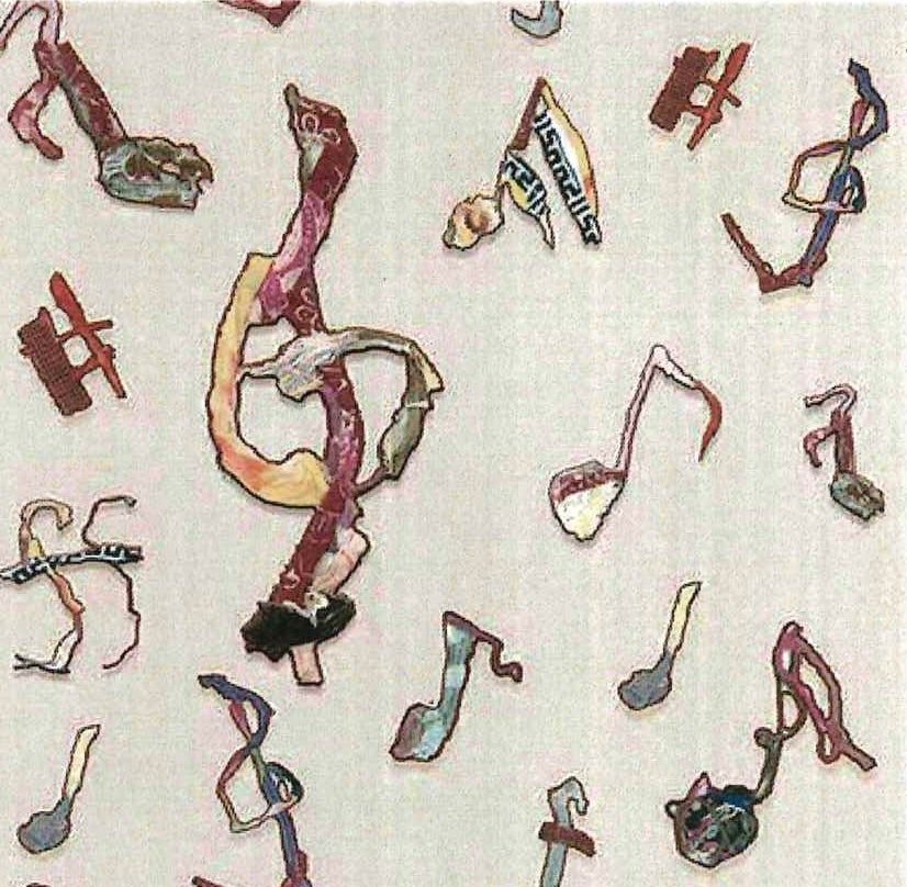 特に、ユニファースト賞に選出された『踊る音符』は、ボンドで紙の上に音符の形を描き、その上にあらかじめ切っておいた布を貼り付けて制作された作品です。音符がはねているような動きを感じさせ、見る人に元気や楽しさを与えたいという思いが込められています。布の質感と手作業のぬくもりが調和し、リズミカルで明るい印象をもつデザインとなっています。見えない"音"や"感情"をカタチにした『踊る音符』は、まさに当社のブランドスピリットを体現する作品です。
