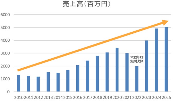 当社は、2010年の売上13億円から2025年には約50億円へと成長し、15年間で約3.8倍の拡大を達成しました。この実績を背景に、2035年までに売上高100億円の実現を目指す長期ビジョンを掲げ、「100億宣言企業」としての新たな一歩を踏み出しました。また、2025年9月には本社を東京都墨田区両国へ移転しました。社員の交流促進と業務効率化を目的とした新オフィス環境の整備を通じて、成長に向けた組織基盤の強化を進めています。