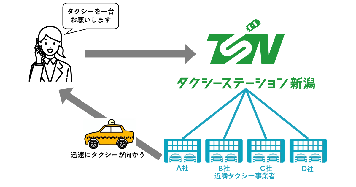 このたび万代タクシーが開始する共同配車事業「タクシーステーション新潟」では、一つの電話番号で複数事業者のタクシーを呼ぶことが可能になり、利用者の手間が格段に減り利便性の向上が期待できます。